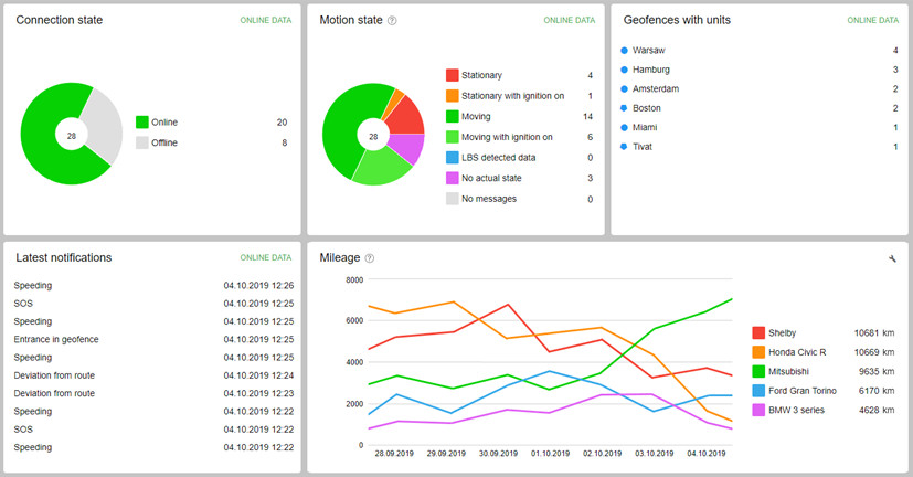 Nástroje pro přehledné zobrazení statistik ve formě grafů nebo tabulek. S jejich pomocí můžete kontrolovat a prezentovat nejdůležitější údaje o vaší flotile.